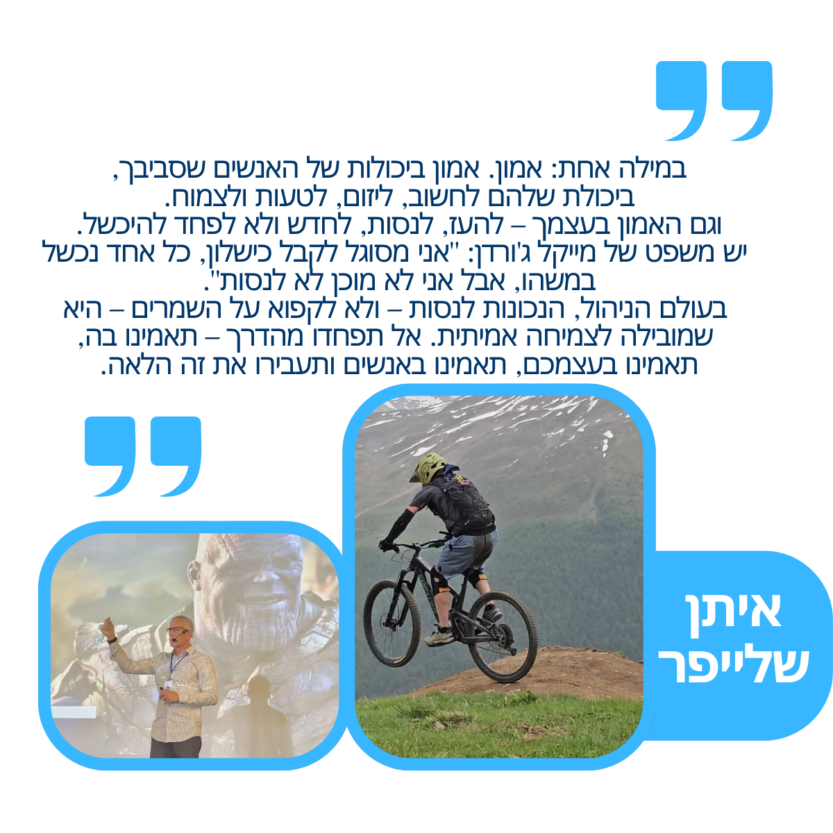 יש משפט של מייקל ג'ורדן: "אני מסוגל לקבל כישלון, כל אחד נכשל במשהו, אבל אני לא מוכן לא לנסות". בעולם הניהול, הנכונות לנסות – ולא לקפוא על השמרים – היא שמובילה לצמיחה אמיתית. אל תפחדו מהדרך – תאמינו בה, תאמינו בעצמכם, תאמינו באנשים ותעבירו את זה הלאה.