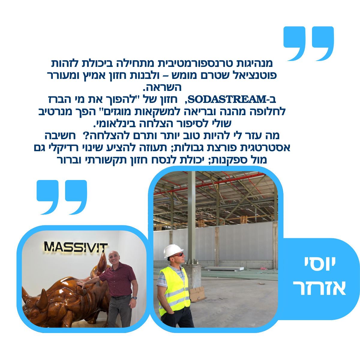 חזון ברור ואומץ לשבור תבניות – למשל ב-SodaStream, חזון להפוך את מי הברז לחלופה מהנה ובריאה הפך לסיפור הצלחה בינלאומי.